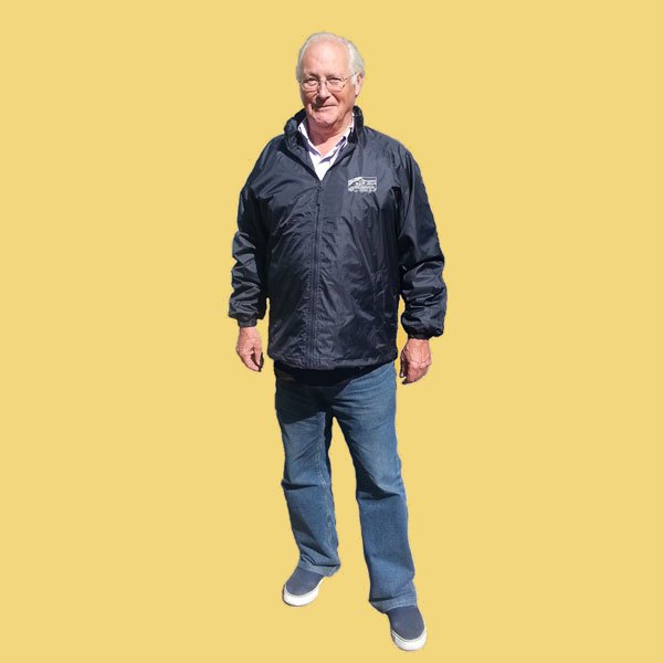 Un coupe-vent de couleur bleu, disponible en plusieurs tailles (M, L, XL et XXL).